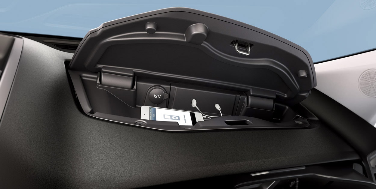 Storage compartment with power point, Aux and USB ports above instrument cluster.