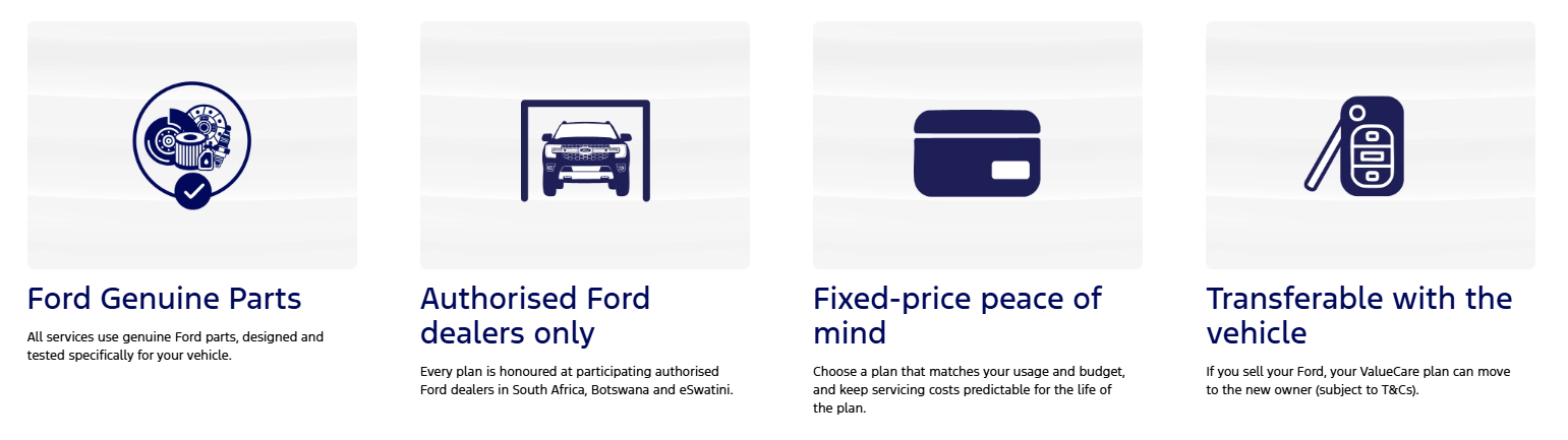 Ford ValueCare is a prepaid service plan for your Ford. You lock in future service costs at today’s pricing, then simply book your services as normal at an authorised Ford dealer. All scheduled items are covered as per Ford’s service schedule, using genuine Ford parts and trained technicians. A plan that offers a promise of complete confidence, ensuring every journey is safe, worry-free, and financially smarter.